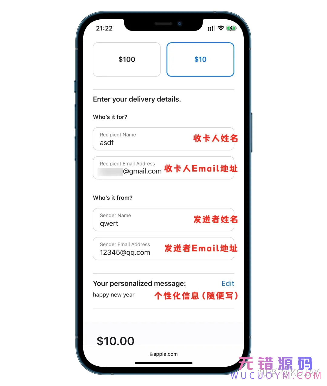 收卡人姓名可以随便填,收卡人 Email 地址这边填写上你的 Gmail 邮箱地址,这个是接收礼品卡卡号的邮箱,一定不要填错,确保邮箱能收到邮件。发送者姓名也可以随便填,发送者 Email 地址可以填你的 QQ 邮箱或者 163 邮箱都可以。接着个性化信息也可以随便填,比如“happy new year”。