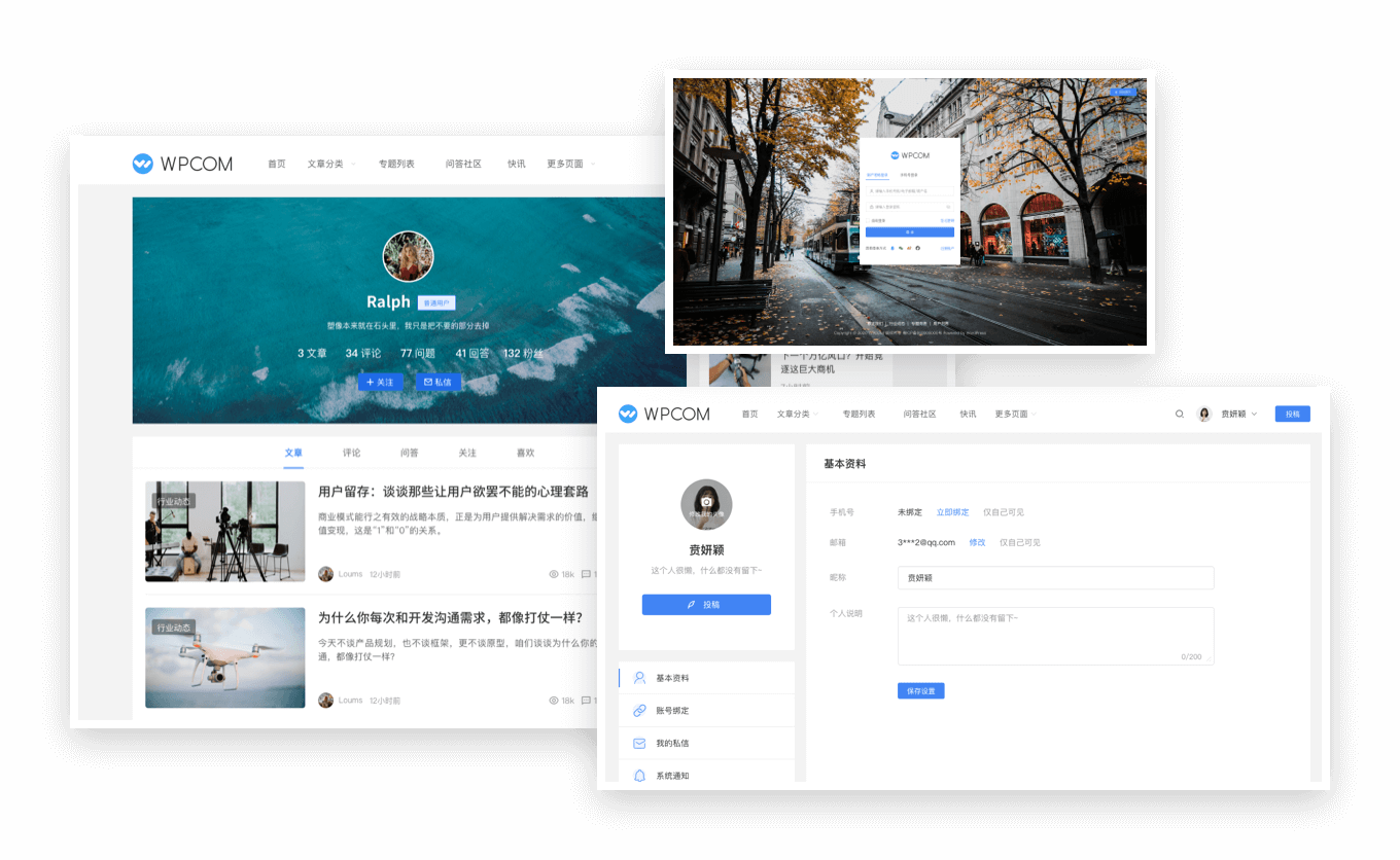 JustNews主题支持我们原创的用户中心插件WPCOM Member,可支持邮箱和手机注册登录以及国内外常见社交媒体登录,主题更增加了私信、关注等实用功能查看主题演示