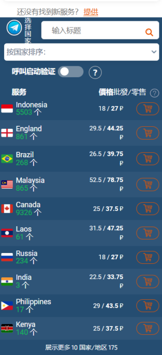选择号码国家,点击对应国家后面的购物车图片即可。目前选择印度的比较多,因为价格便宜。