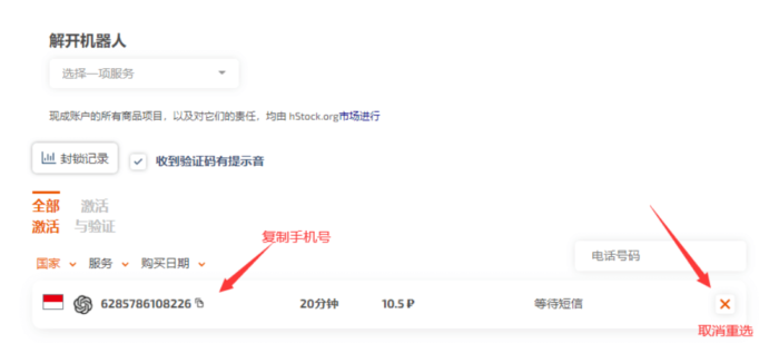 充值完成后,选择对应的业务,sms-activate 这个平台必须选择你对应的注册业务,不要乱选。否则不会显示验证码。
