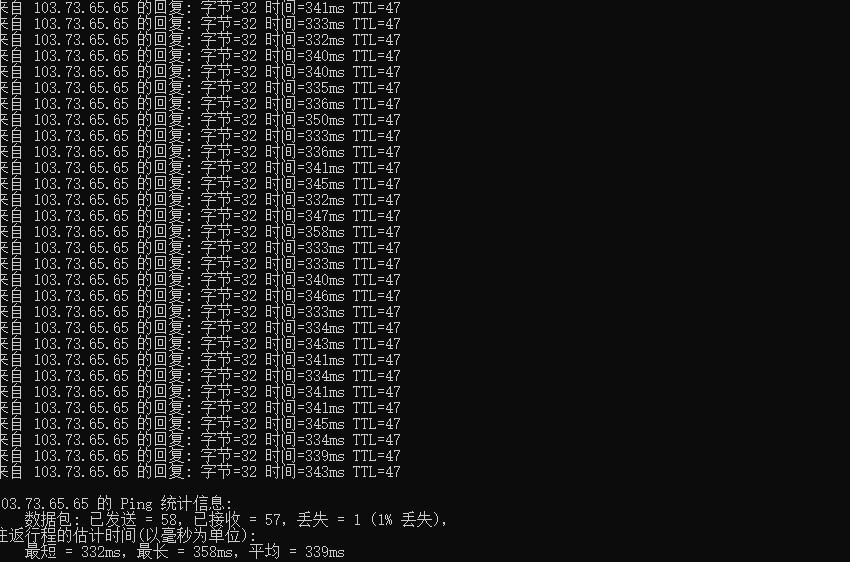 可以看到本地Ping的延迟效果在339ms左右,网络偶尔有丢包的情况,毕竟是澳大利亚VPS,做到1%的丢包率或者不错了吧。
