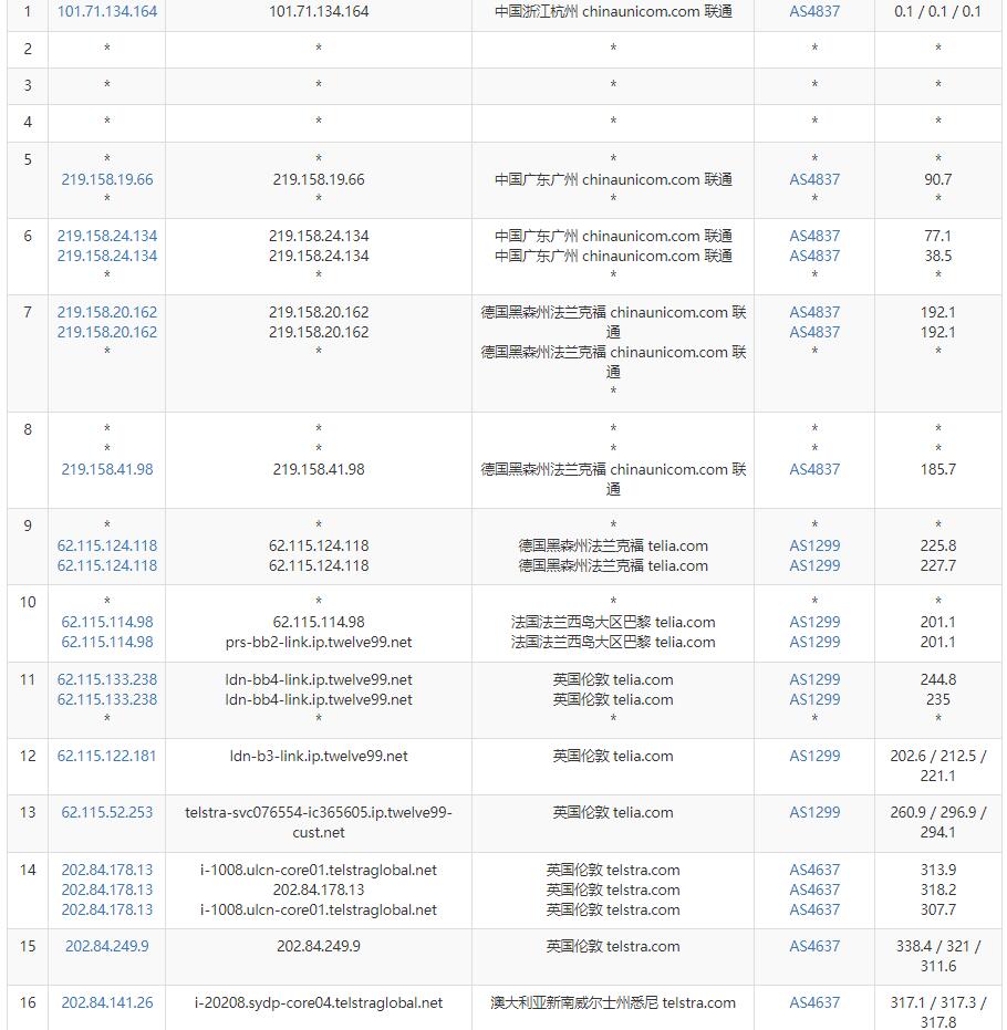 联通网络去程是绕道欧洲德国、英国,最后再到达澳大利亚机房。