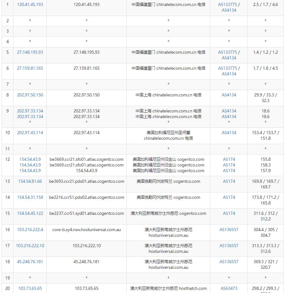 可以看到电信去程是先绕道美国各节点,然后再到达澳大利亚机房的。
